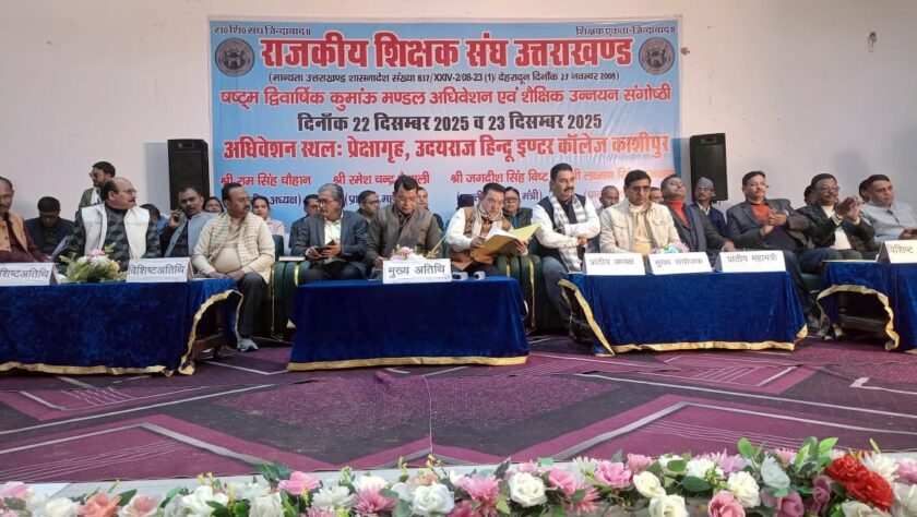 काशीपुर। उदयराज हिंदू इंटर कालेज के प्रेक्षागृह परिसर में राजकीय माध्यमिक शिक्षक संगठन कुमायूं मंडल के द्विवार्षिक अधिवेशन एवं शैक्षिक उन्नयन गोष्ठी का शुभारंभ मुख्य अतिथि रुद्रपुर भाजपा विधायक शिव अरोरा एवं कार्यक्रम अध्यक्ष नगर निगम महापौर दीपक बाली समेत प्रांतीय संगठन पदाधिकारियों ने मां सरस्वती के चित्र पर माल्यार्पण एवं दीप प्रज्वलित कर किया। इससे पूर्व मुख्य अतिथि समेत सभी मंचासीन पदाधिकारियों का बैज अलंकरण कर फूल मालाओं से पदाधिकारियों ने स्वागत किया। शैक्षिक उन्नयन गोष्ठी के दौरान राजकीय शिक्षक संघ के प्रदेश अध्यक्ष रामसिंह चौहान तथा प्रदेश महामंत्री रमेश चंद्र पैन्यूली ने शिक्षकों के शासन में लम्बित प्रकरणों एवं उनकी समस्याओं की लगातार सरकार और विभाग द्वारा अनदेखी के साथ साथ उपेक्षा की जा रही है। उन्होंने शिक्षकों के हितों और उनकी न्यायोचित मांगों को मुख्य अतिथि के समक्ष रखते हुए उनसे सरकार तक पहुंचाने का अनुरोध किया।