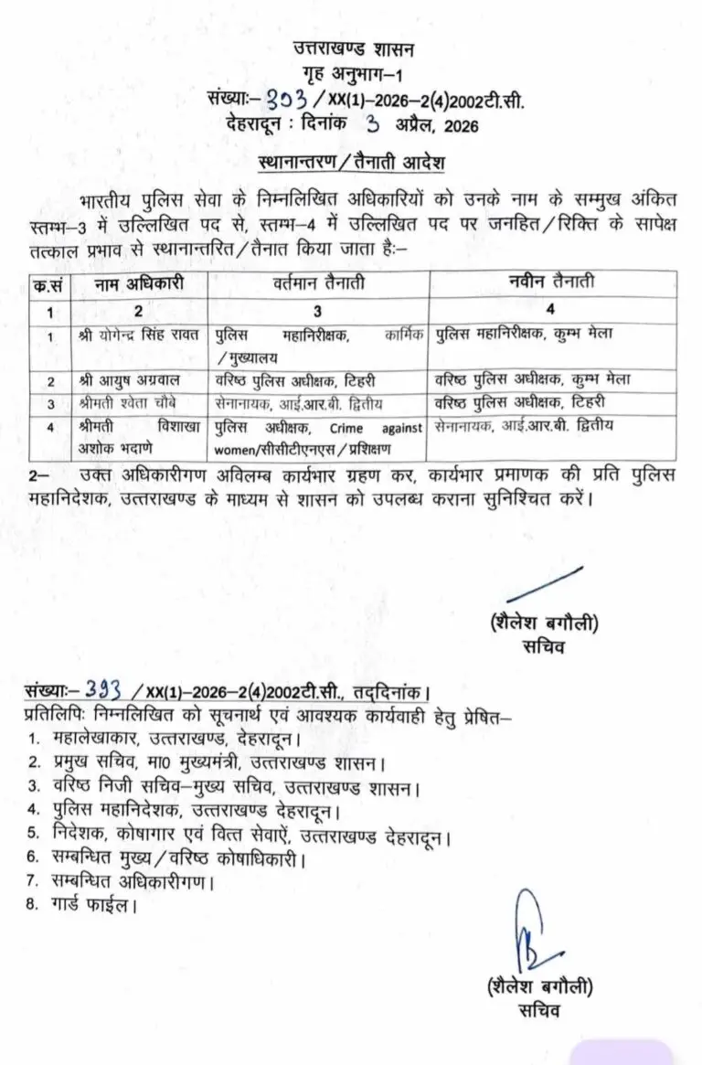 देहरादून l उत्तराखंड शासन के गृह अनुभाग द्वारा 3 अप्रैल 2026 को जारी आधिकारिक विज्ञप्ति संख्या-393/XX(1)-2026-2(4)2002टी.सी. के अनुसार, प्रदेश की पुलिस व्यवस्था में प्रशासनिक फेरबदल करते हुए भारतीय पुलिस सेवा के चार उच्चाधिकारियों को जनहित में तत्काल प्रभाव से नवीन तैनाती दी गई है। सचिव शैलेश बगौली के हस्ताक्षर से निर्गत इस आदेश के तहत पुलिस महानिरीक्षक (कार्मिक/मुख्यालय) श्री योगेन्द्र सिंह रावत को पुलिस महानिरीक्षक कुंभ मेला के सामरिक पद पर नियुक्त किया गया है, वहीं टिहरी के वरिष्ठ पुलिस अधीक्षक श्री आयुष अग्रवाल को अब वरिष्ठ पुलिस अधीक्षक कुंभ…